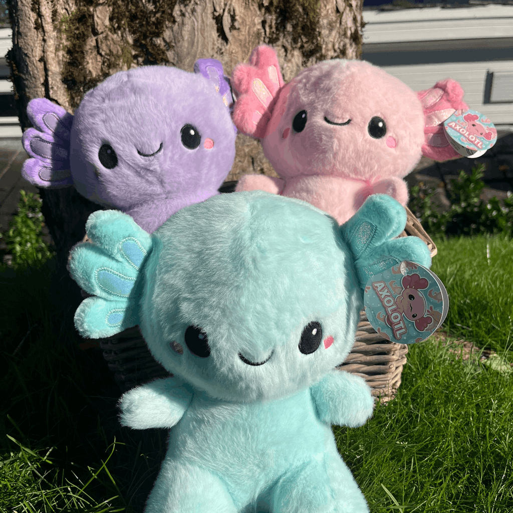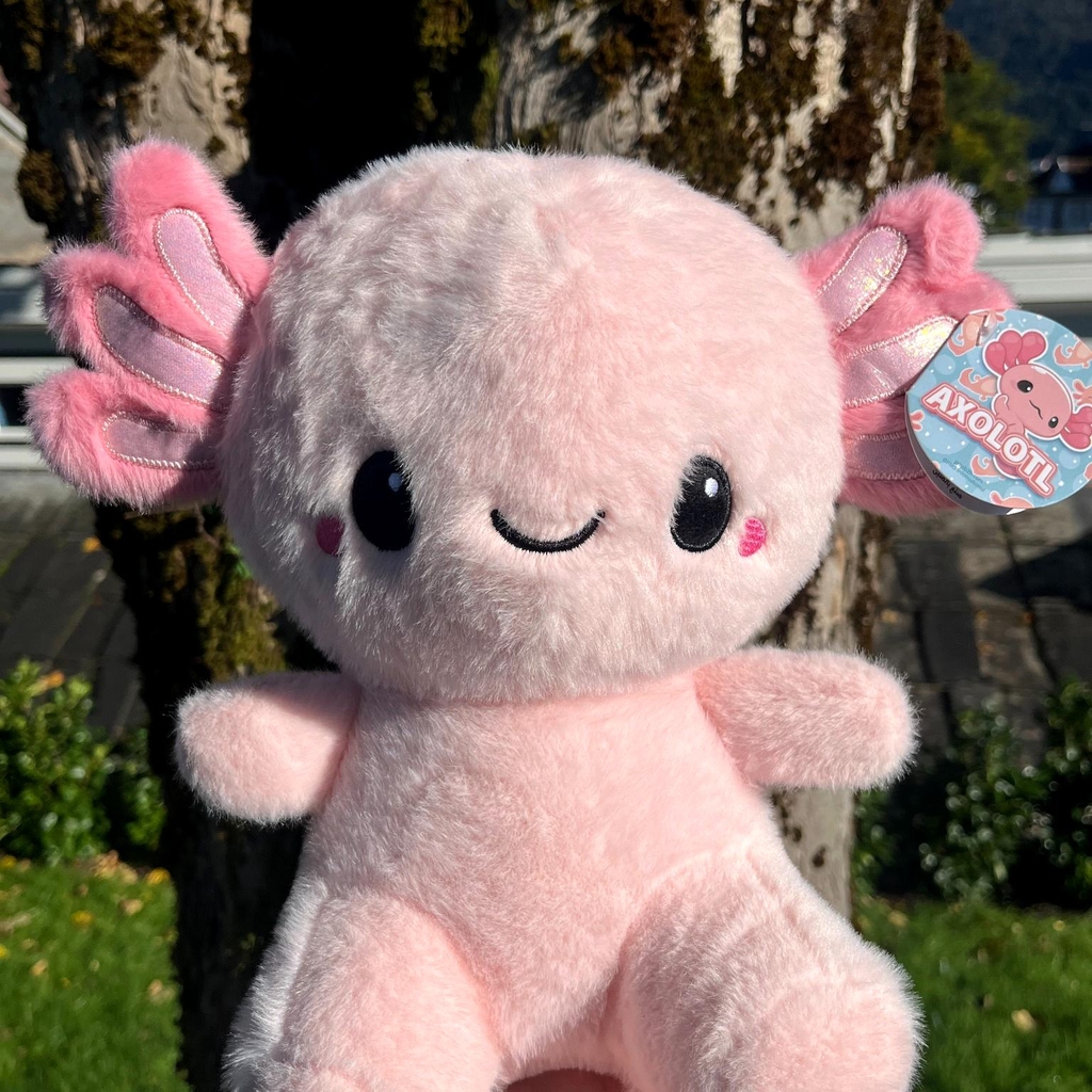 Myk Axolotl bamse med et søt smil som er klar for masse klemmer og lek.