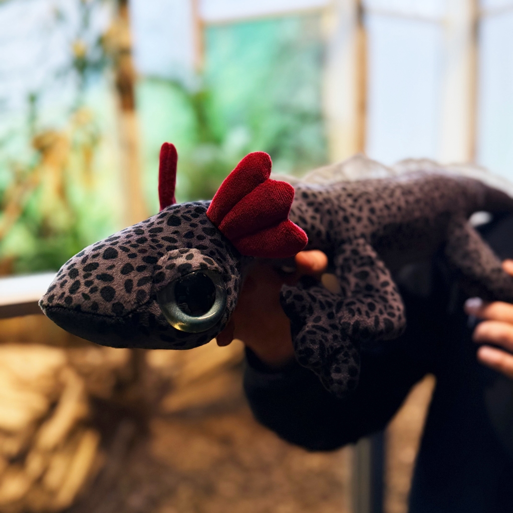 Bamsen har en langstrakt kropp med korte ben, avrundet hode og tydelige gjeller som gir et gjenkjennelig axolotl-utseende. Den mørke, flekkede fargen gir et mer realistisk og litt tøffere preg, samtidig som materialet er mykt og behagelig å ta på. En flott kombinasjon av lek og dekor.