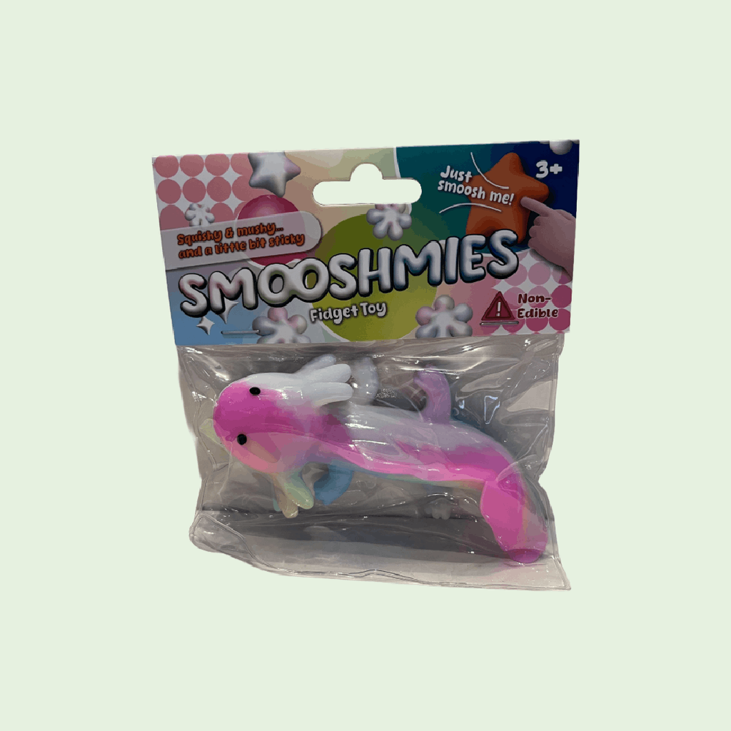 Myk og klembar Smooshmies-leke formet som en axolotl. Perfekt for små hender som liker å klemme og strekke! Kommer i ulike fargevarianter.
