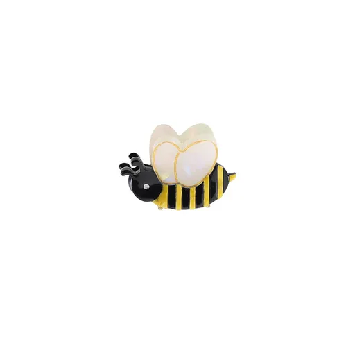 Hårklypen har en detaljert bieform med de klassiske gule og svarte stripene som danner selve kroppen. De små hvite vingene i perlemor-finish gir et løft til designet og skaper en fin kontrast mot den blanke overflaten. Den kompakte størrelsen gjør den diskret, men samtidig synlig nok til å gi frisyren personlighet.