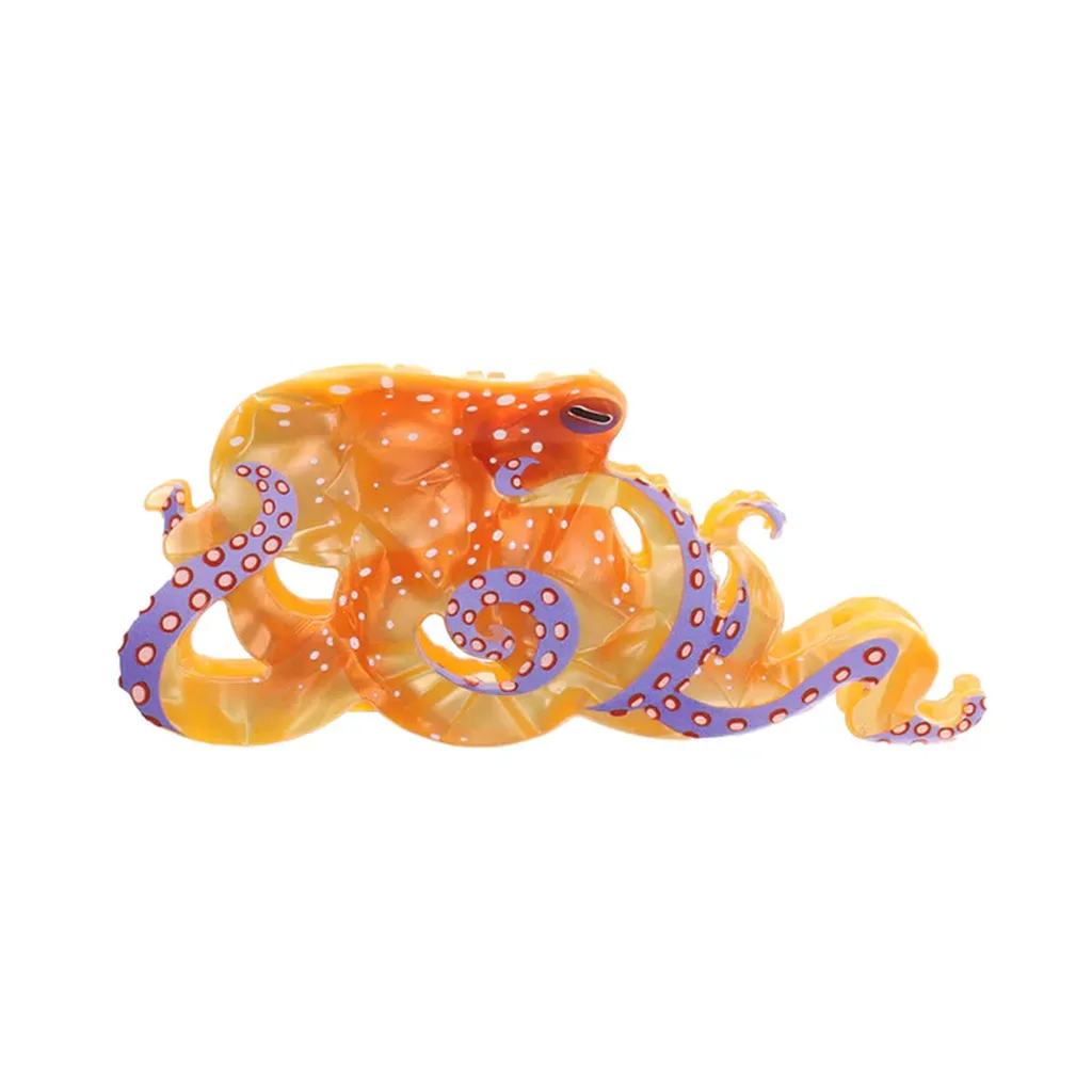 Hårklypen har en tredimensjonal blekksprutform der armene slynger seg rundt og danner selve klypens struktur. Fargen går i varme oransje og gylne toner med et marmorlignende fargespill, kombinert med kontrastfargede detaljer på armene. Overflaten fremstår blank og glatt, noe som gir et samlet og ryddig uttrykk.