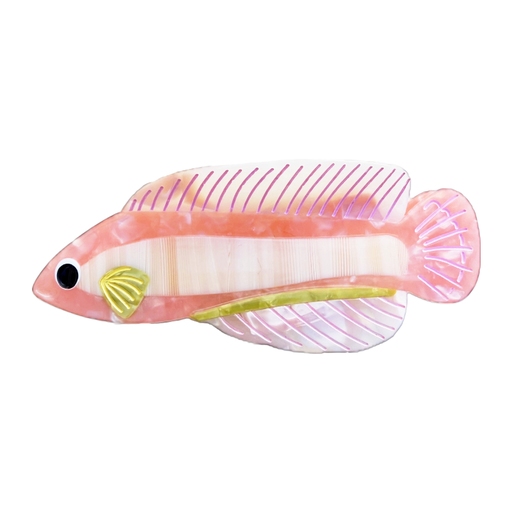 Hårklypen har en unik, smal form med detaljerte finner som strekker seg langs hele kroppen. Fargen går i varme korall- og ferskentoner med et subtilt marmorlignende spill, kombinert med kontrasterende lilla striper og en liten gullfarget finne ved hodet. Overflaten er blank og polert, noe som gir et samlet og eksklusivt uttrykk.
