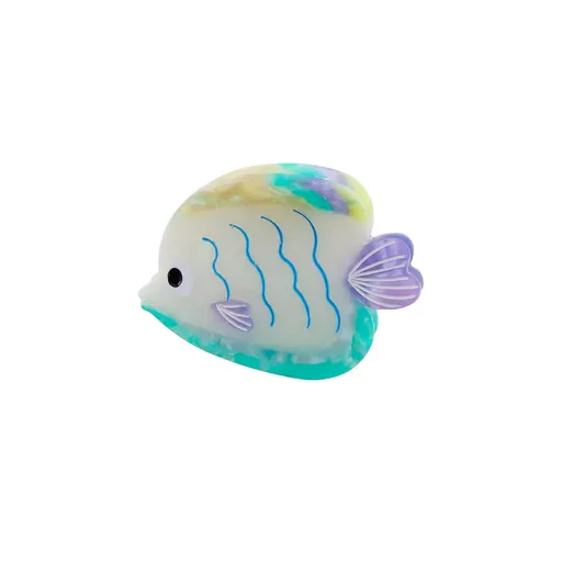 Hårklypen har en detaljert fiskeform med dekorative blå bølgelinjer langs kroppen og finner med et vakkert fargespill. De tropiske fargene kombinerer duse hvite toner med marmorerte detaljer i lilla, turkis og gult, noe som gir hver klype et unikt og livlig utseende. Overflaten fremstår blank og glatt, som gir et samlet og ryddig uttrykk i håret.