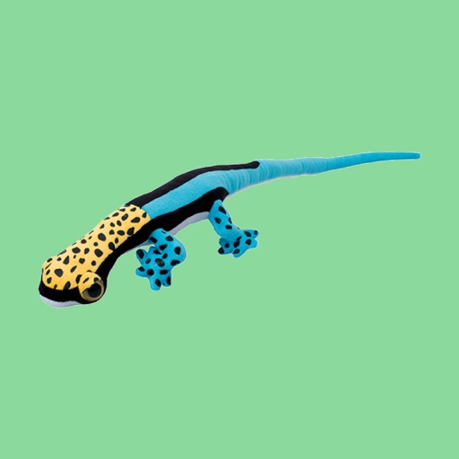 Denne blå gekko-bamsen på 60 cm er en fargerik og spennende kosefigur med et lekent og naturinspirert design. Den lange kroppen, den slanke halen og de markerte føttene gir et realistisk preg – samtidig som den er myk, fleksibel og god å klemme.