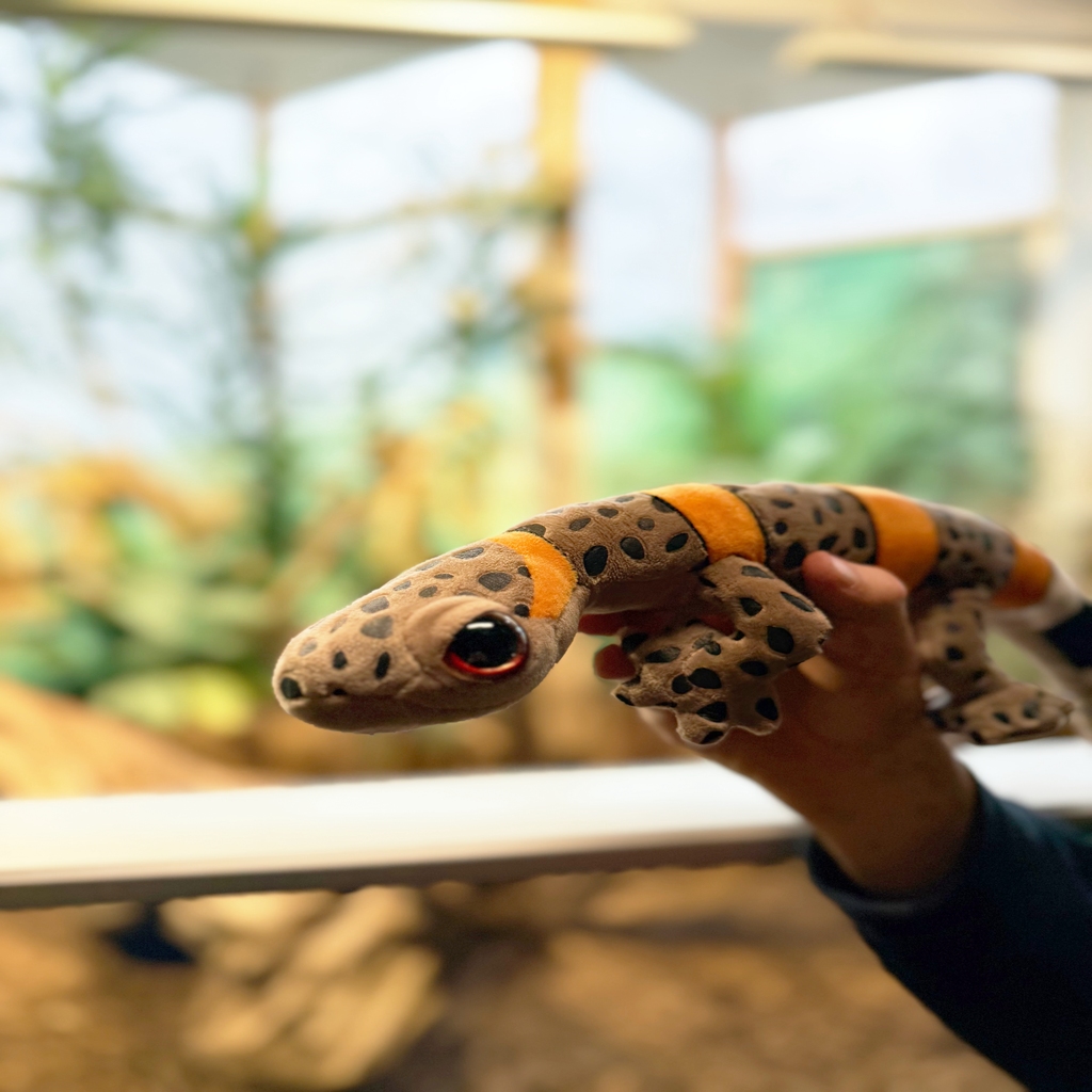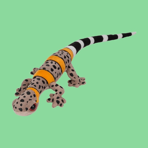 Med sine fire solide bein og lange kropp ligger bamsen stabilt på underlaget. De tydelige prikkene og kontrastfargene gir et spennende og realistisk uttrykk inspirert av ekte gekkoer. De store, markerte øynene gir bamsen et levende og karakterfullt preg.