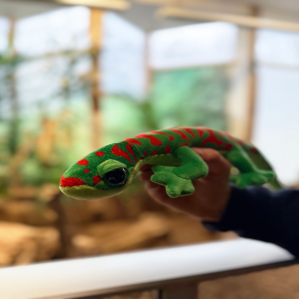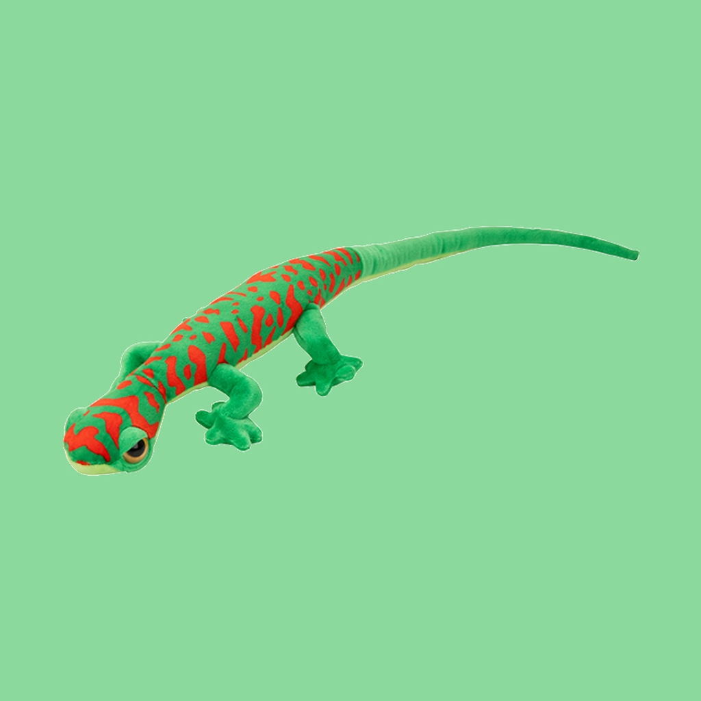 Med sine 60 cm har gekkoen en størrelse som gjør den enkel å håndtere for barn, samtidig som den er stor nok til å synes godt i rommet. Den lange halen gir et naturtro uttrykk, og de brede føttene gjør at den ligger stabilt på underlaget.