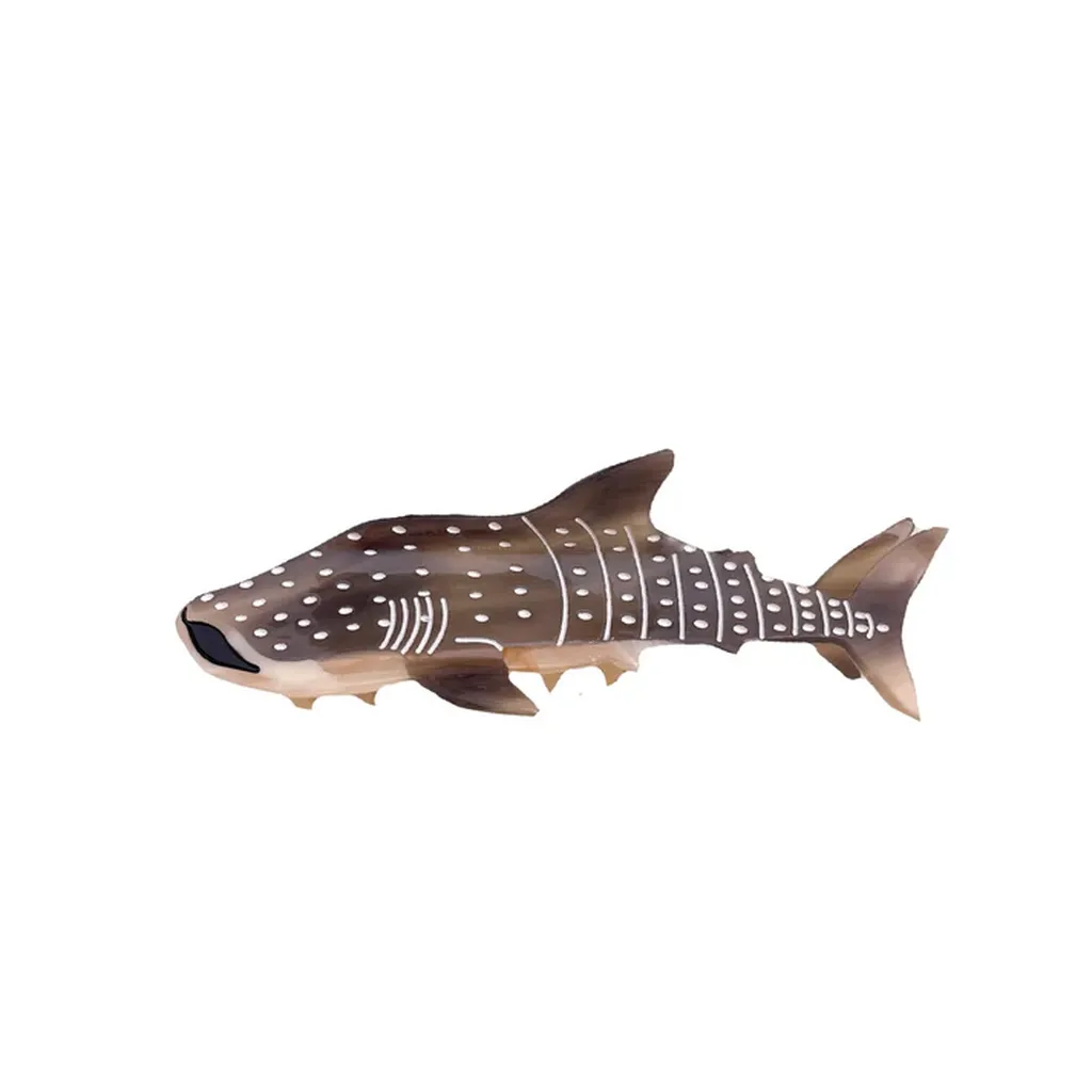 Hårklypen har en langstrakt haiform med markert hode, ryggfinne og hale. Fargen går i brune og beige toner, kombinert med lyse prikker og linjedetaljer som gir overflaten et strukturert preg. Overflaten fremstår glatt og blank, og det lett marmorlignende spillet i materialet gir dybde uten å virke dominerende.