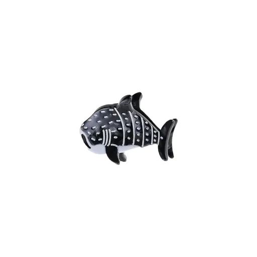 Hårklypen har en stilisert haiform med markert hode, ryggfinne og hale. Fargen er hovedsakelig svart, kombinert med lysere partier som gir kontrast og gjør formen lett gjenkjennelig. Overflaten fremstår glatt og blank, og det enkle uttrykket gjør at klypen fungerer både som pynt og som praktisk hårtilbehør.