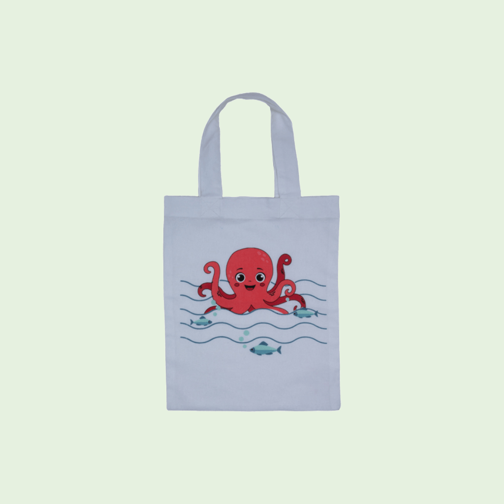 Dette herlige handlenettet i barnestørrelse er laget spesielt for små hender og store eventyr! Med en smilende blekksprut på fronten og myke, behagelige håndtak, er nettet perfekt til å bære leker, kosedyr, bøker eller dagens skatter fra turen.