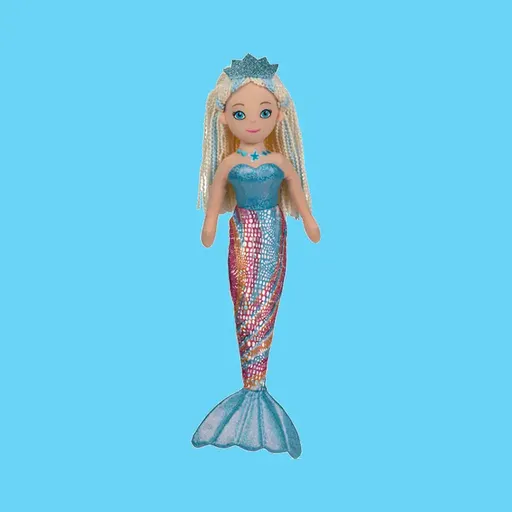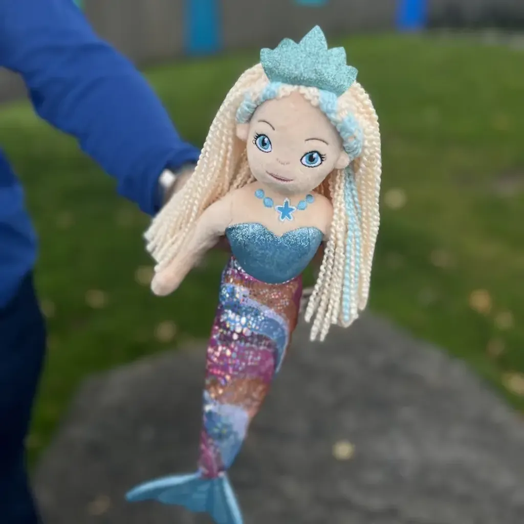 Bamsen har en tydelig havfrueform med overkropp, lang hale og avrundet finne nederst. Den blå fargepaletten kombineres med mønstrede detaljer i halen, som gir et livlig og fantasifullt uttrykk. Ansiktet har et vennlig preg, og håret er formet som lange, lyse fletter som gir ekstra tekstur og visuell variasjon. Overflaten fremstår jevn og myk, med detaljer som er tydelige uten å virke harde.