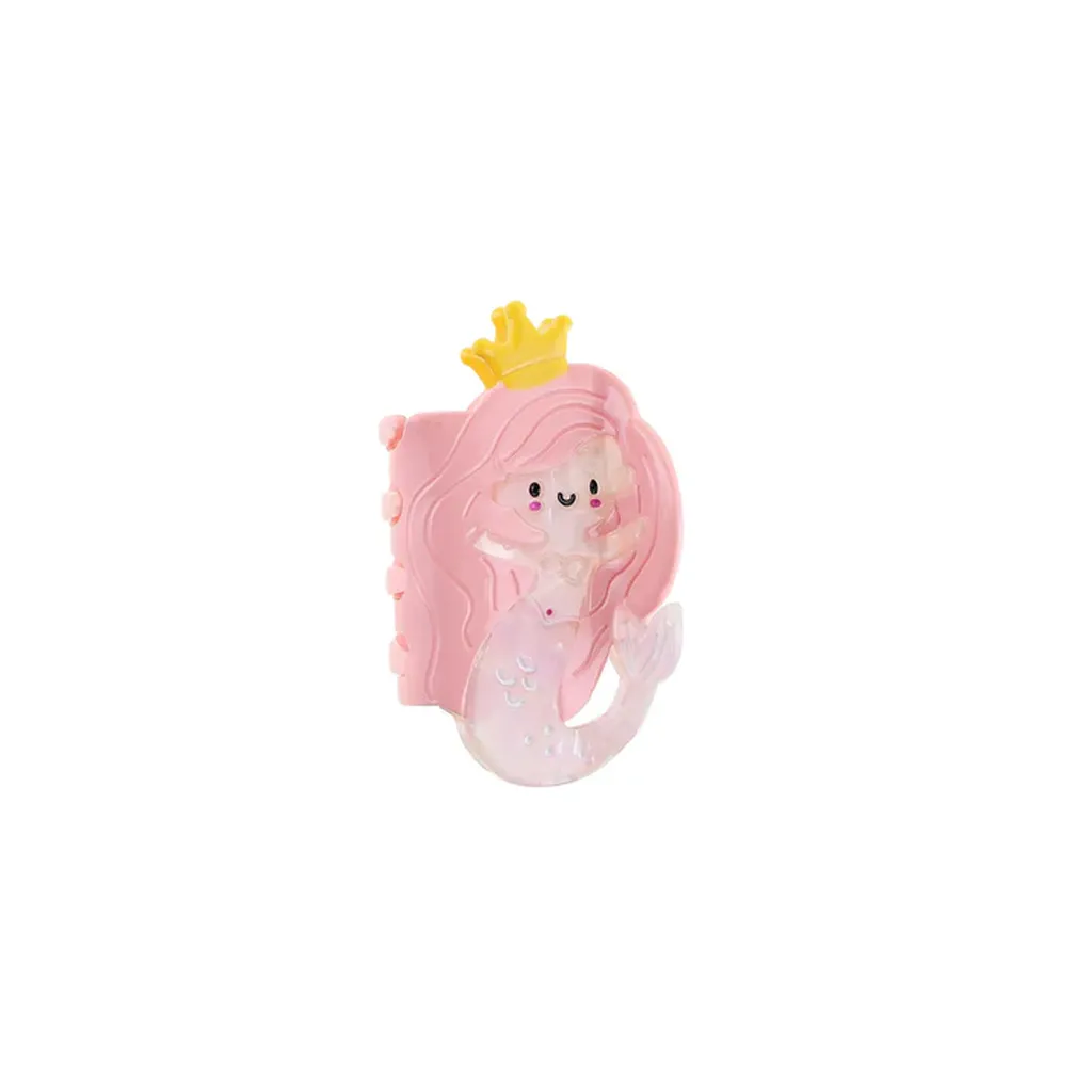 Hårklypen har en stilisert havfrueform med avrundet ansikt, langt hår og buet hale. Fargene går i myke rosatoner kombinert med lyse, delvis transparente partier i halen. En liten krone på toppen og enkle ansiktsdetaljer gir figuren et vennlig og tydelig preg. Overflaten fremstår glatt og blank, og konturene er tydelig markert uten å virke kraftige.