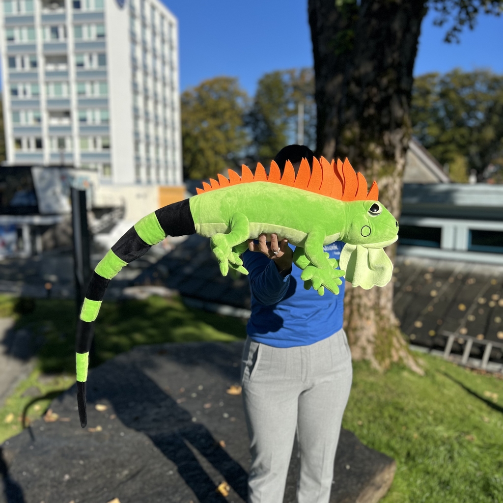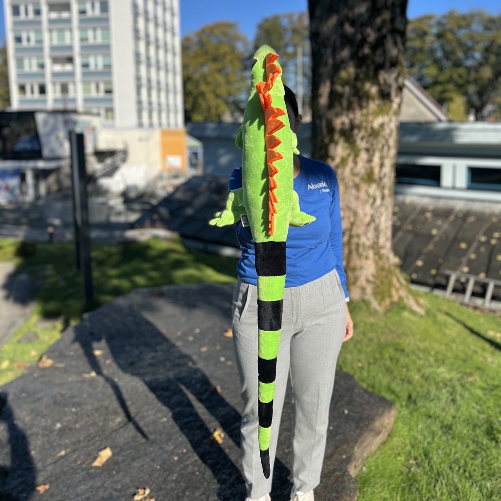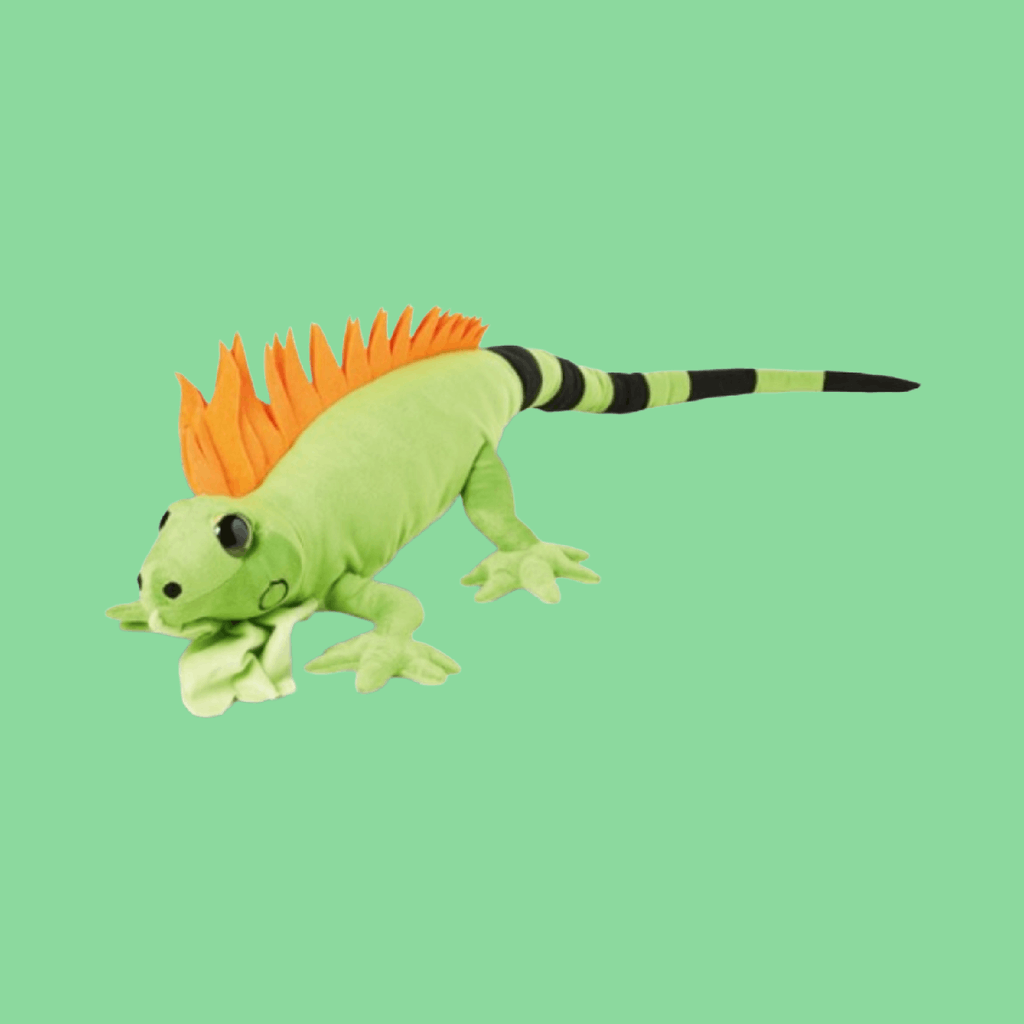 En imponerende og livlig iguan-bamse på hele 100 cm! Med sin klare grønne farge, karakteristiske ryggkam i oransje og lange hale er dette en bamse som virkelig skiller seg ut. Perfekt for barn som elsker reptiler – eller som en kul statement-dekor på rommet.