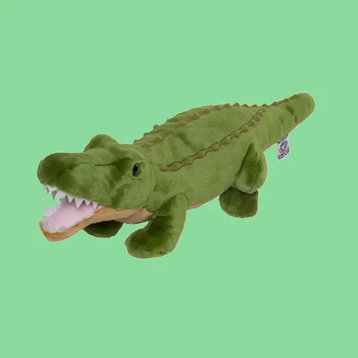Bamsen har en langstrakt kropp med kraftig hale og korte ben som gir et tydelig krokodillepreg. Den grønne fargen kombineres med sømmer og ryggdetaljer som fremhever formen. Munnen er åpen med myke, formede tenner som gir et uttrykksfullt, men vennlig utseende. Overflaten fremstår jevn og behagelig å ta på, med detaljer som er tydelige uten å være harde.