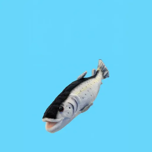 Bamsen har en avlang fiskekropp med markert hode, åpen munn og tydelige finner. Fargene går i grå, sølv og mørkere toner langs ryggen, med små prikkdetaljer som gir et gjenkjennelig laksepreg. Øyet er tydelig og gir figuren et livlig uttrykk, mens overflaten fremstår jevn og myk å ta på.