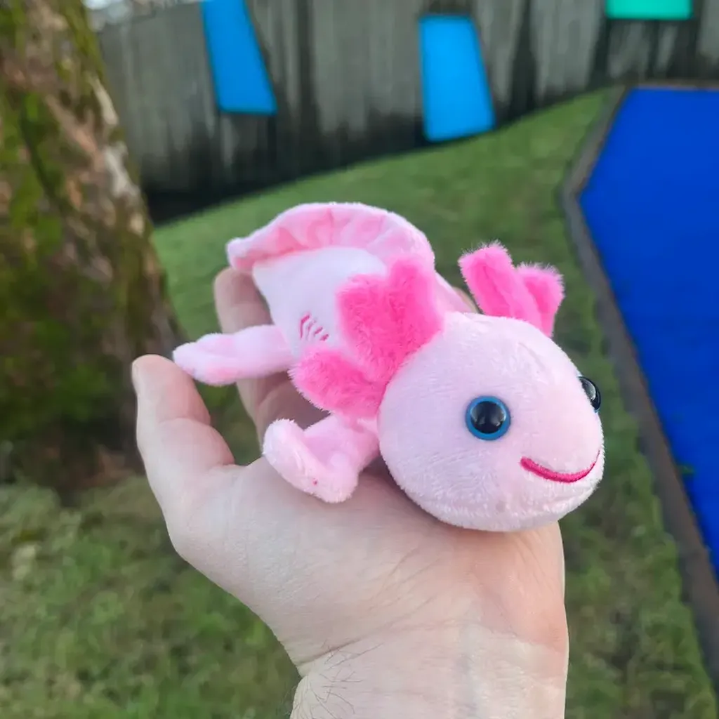 Axolotl-bamsen har myk og fluffy pels, vennlige sikkerhetsøyne og diskrete magneter skjult i potene. Den er like godt egnet som kosedyr for små hender som en dekorativ magnet til å holde beskjeder, tegninger eller handlelister på plass.