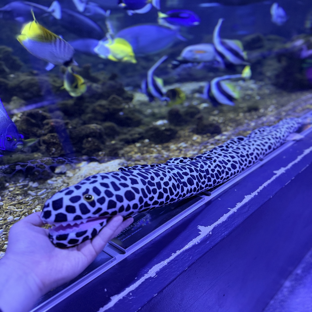 Murene bamse 90 cm – Leopardmurene gir en spennende følelse av havets mysterier, kombinert med god mykhet. Dette kosedyret er en flott gave til barn som elsker marine dyr. Finn den i butikken på Akvariet i Bergen.