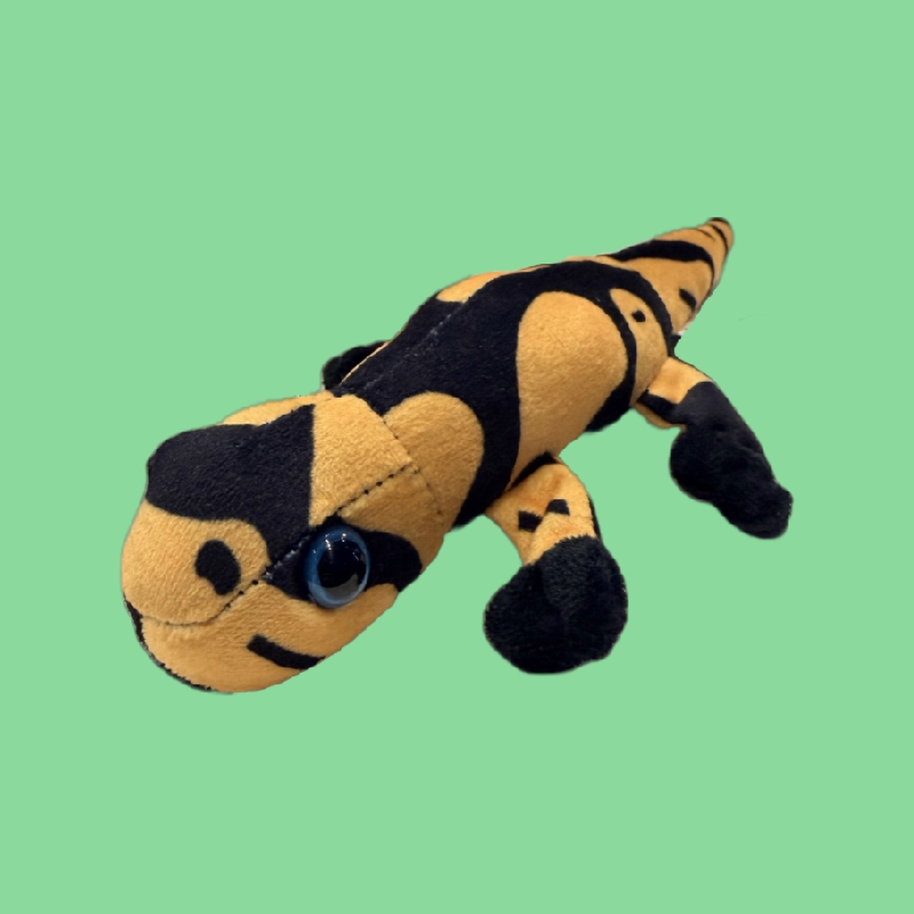 Salamander bamse 24 cm, sjarmerende design i gult og svart med store, uttrykksfulle øyne. Klar for kos og eventyr. Sikre deg din i dag! Akvariet i Bergen