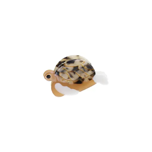 Hårklypen har en avrundet skilpaddeform med markert skall og synlig hode og finner. Skallet har et mønstret uttrykk i brune, beige og mørkere toner, kombinert med fine linjedetaljer som fremhever formen. Hodet og bena er holdt i lysere nyanser, noe som gir god kontrast. Overflaten fremstår glatt og blank, med lett dybde i materialet.