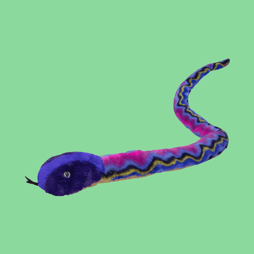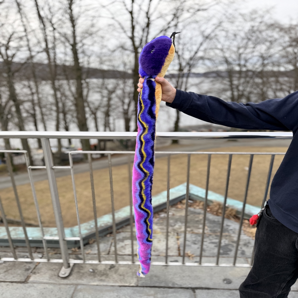 Denne lilla slangebamsen på hele 150 cm er en imponerende og fargerik kosefigur som virkelig skiller seg ut. Den lange, bøyelige kroppen og det levende fargespillet gjør den både spennende i lek og dekorativ på barnerommet.