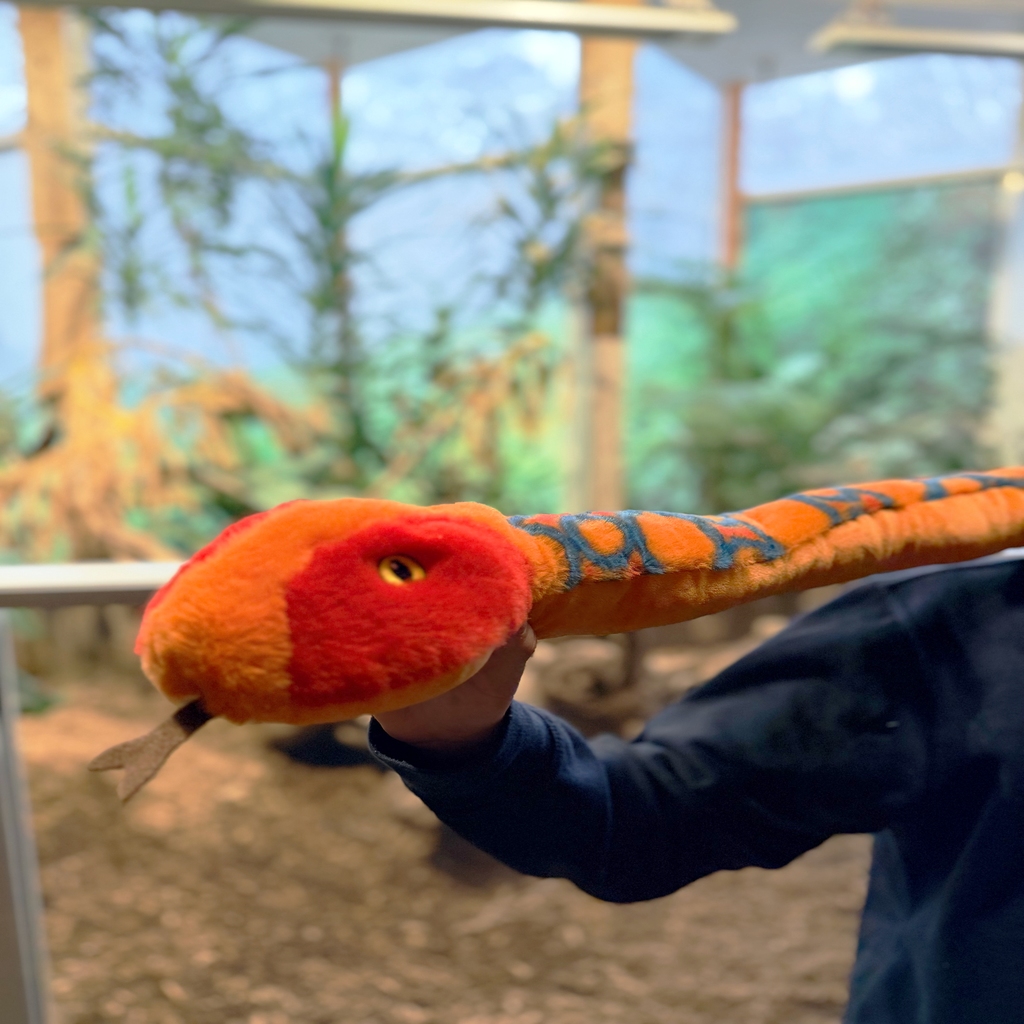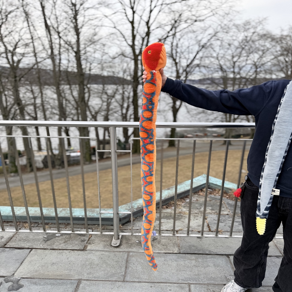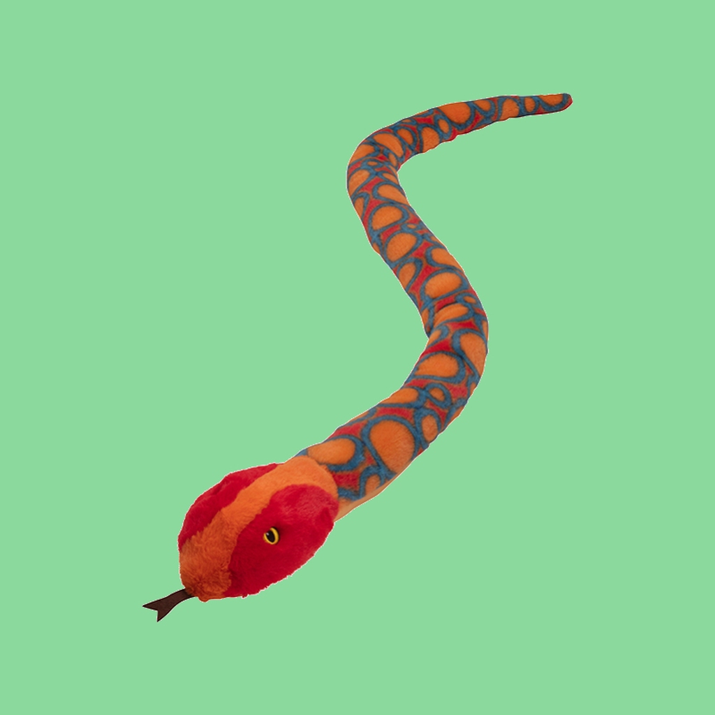 Denne oransje slange-bamsen på hele 150 cm er en lang og iøynefallende kosefigur med et unikt og fargerikt mønster. Den buede kroppen og det detaljerte hodet gir et naturinspirert uttrykk, samtidig som den er myk, fleksibel og behagelig å holde rundt.
