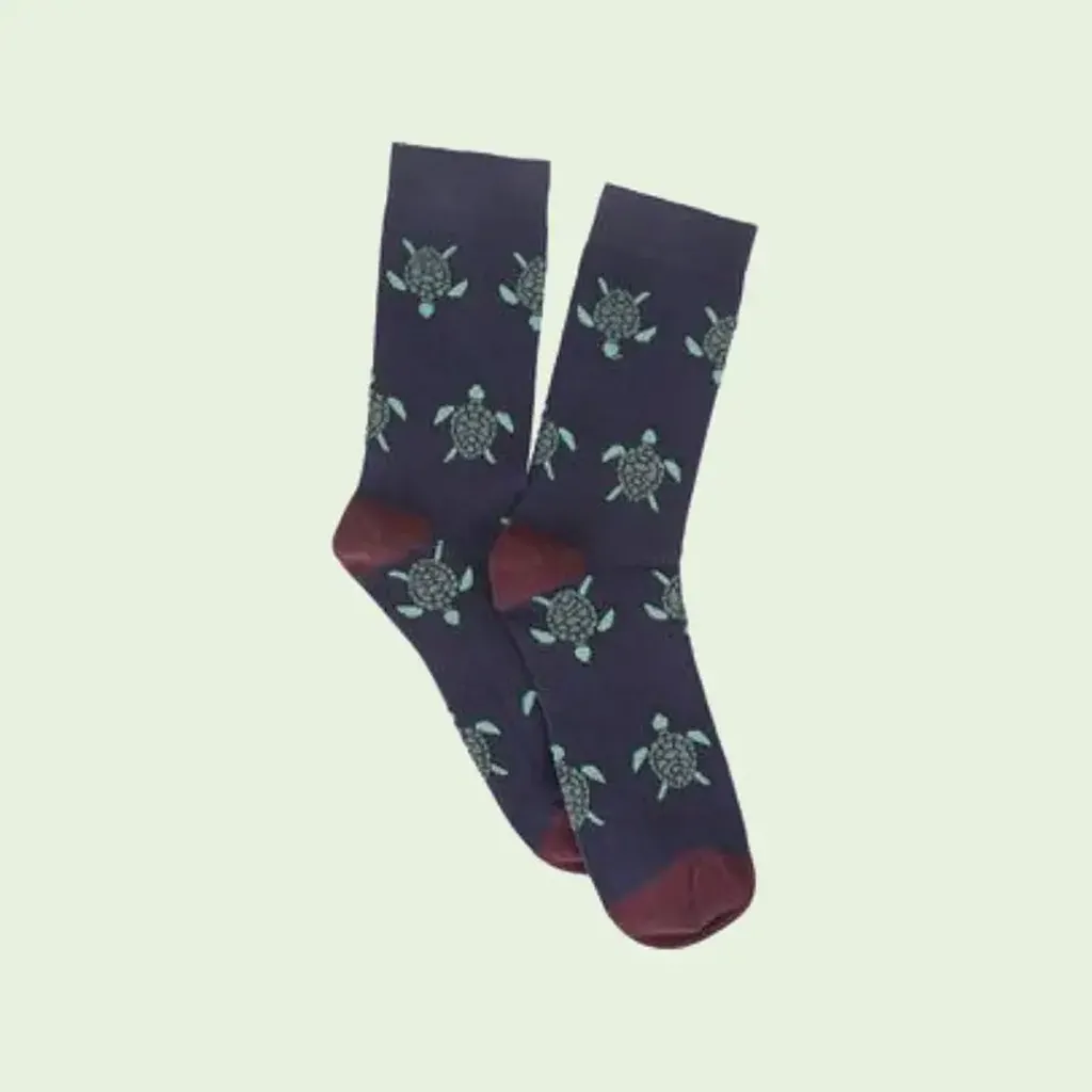 Gi hverdagen et personlig preg med skilpadde-sokker i str. 43–46. Komfortabel bomullsmiks med mørk base og stilrent dyremotiv. Se dem her!