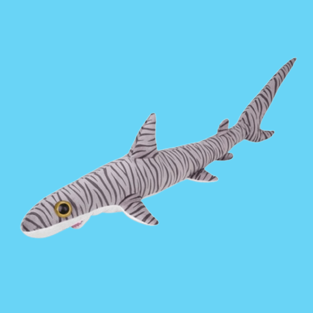 Myk Tigerhai bamse som passer for både barn og voksne. Et trygt kosedyr til lek og rolige stunder.