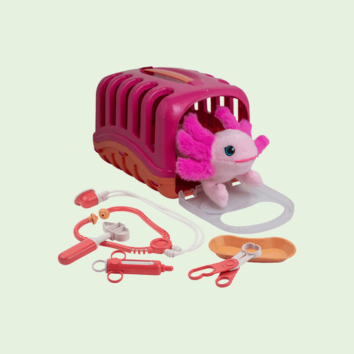 Søtt veterinærsett med myk rosa axolotl, transportbur og alt utstyr små dyrepassere trenger for å undersøke og ta vare på sin nye vannvenn.