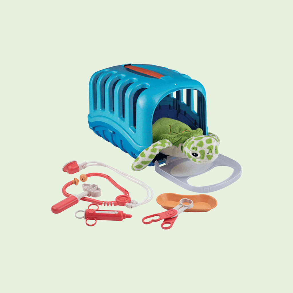 Med stetoskop, sprøyte, saks, termometer og flere andre verktøy kan små veterinærer undersøke, behandle og ta vare på skilpadden sin om og om igjen. Buret er laget i robuste barnevennlige materialer, og både dyret og utstyret er designet for å tåle masse lek.